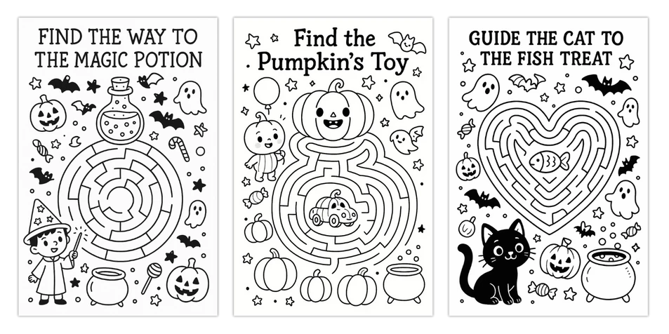 → Design black-and-white Halloween maze coloring pages for kids — perfect for activity books, worksheets, or Etsy printables.