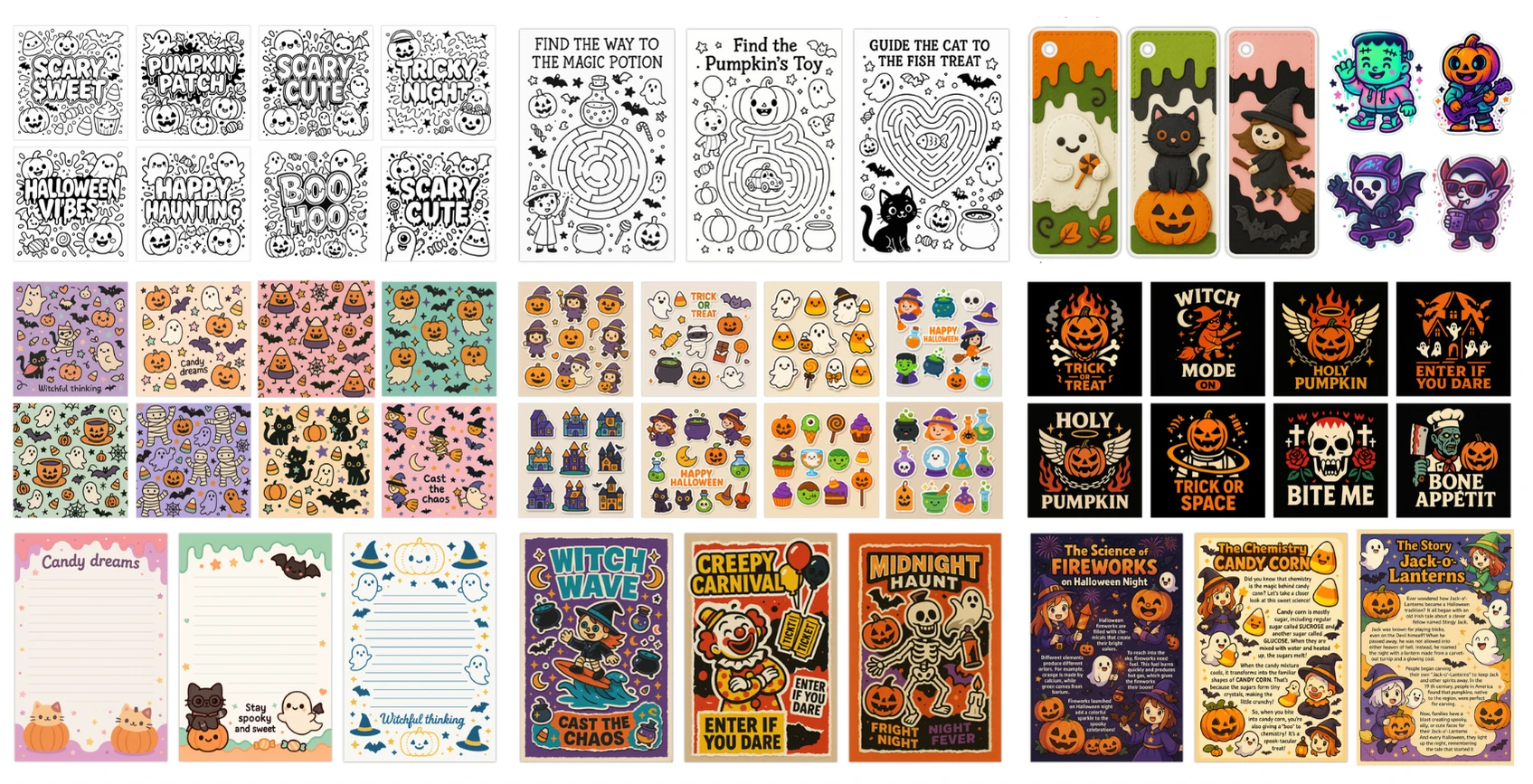 You can make coloring books, stickers, posters, t-shirt designs, planners, and clip art packs — all Halloween-themed and ready to publish.