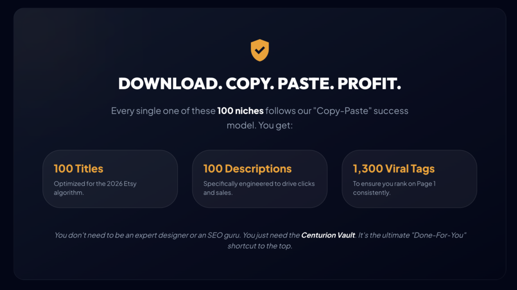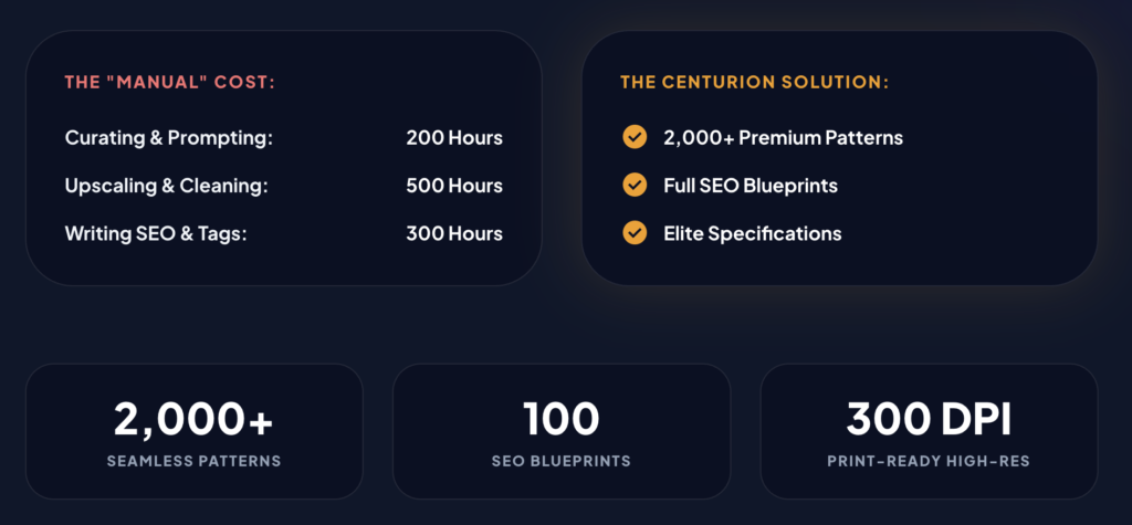If you tried to build this 100-niche empire yourself, you’d spend over 1,000 hours curating, upscaling, and SEO writing. The Centurion Vault gives you all of this INSTANTLY.